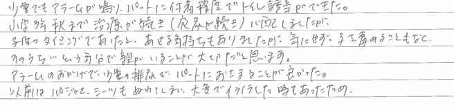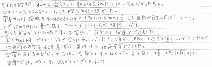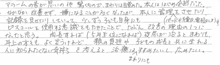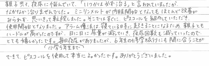 親子共々、夜尿に悩んでいて、「いつかは必ず治る」と言われていましたが、なかなか治りませんでした。ミニリンメルトが内服開始となってもほとんど改善がみられず、思いきって転院しました。そこではすぐにピスコールを紹介していただき、使用開始となりました。アラーム療法は寝ている時に起きる事になるため、親子ともハードルが高かったのですが、日に日に尿量が減っていき、夜尿回数も減っていったのでとても嬉しかったです。