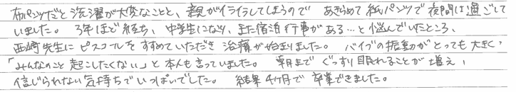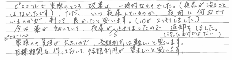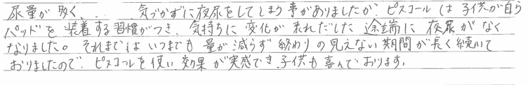 小学5年生まで毎日夜尿がありましたが、6年生の修学旅行にも間に合うことができて、ピスコールを使用して本当によかったです。