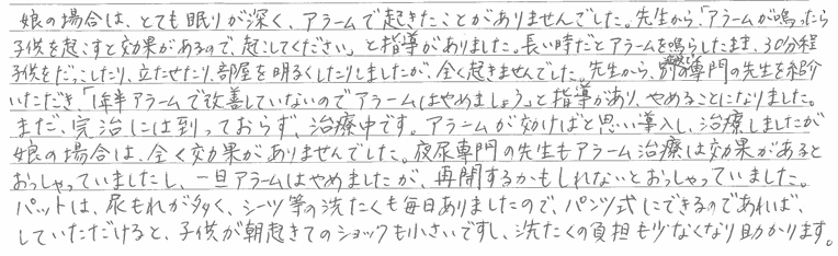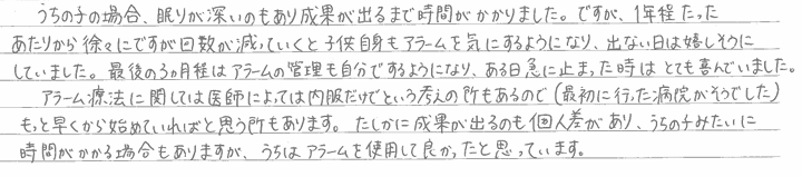 娘の場合はとても眠りが深く、アラームで起きたことがありませんでした。先生から「アラームが鳴ったら子どもを起こすと効果があるので起こしてください」と指導がありました。長い時だとアラームを鳴らしたまま30分程子どもをだっこしたり、立たせたり、部屋を明るくしたりしましたが、全く起きませんでした。先生から別の病院で専門の先生を紹介いただき、「1年半アラームで改善していないのでアラームはやめましょう」と指導があり、やめることになりました。