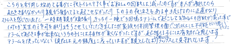 こちらを利用し始めて確かに夜トイレへ行く事でおねしょの回数は減ったのですが、本人が疲れてたら起きられなかったり、親が疲れていると起こせなかったり、下の子の夜泣きもある中続けるのに正直かなりストレスを感じていました。