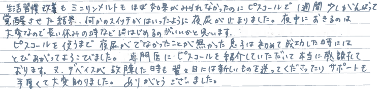 最初はアラームで下の弟や親までも寝不足続きでしたが治療を始めてよくなっていきました。
