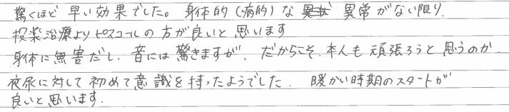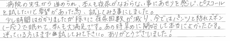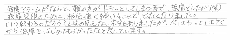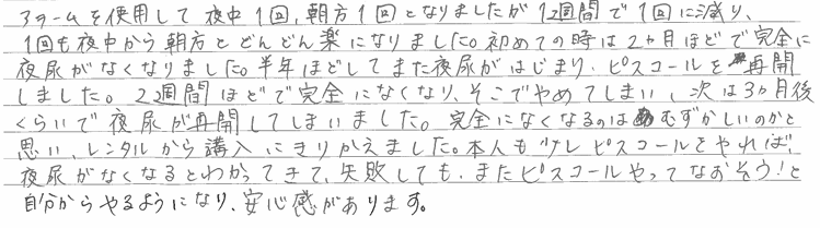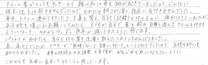 毎日トイレへ連れていったり、下着を替え、日記(記録)を付けるのに疲れ果てていましたが、ある時を境に子へお願いしてみたら、子どもが自分で薬を飲み、自らすすんでアラームを付けるようになって、それから少しづつ夜尿が減ってきたように感じます。