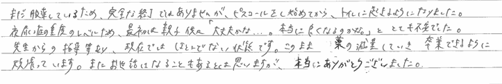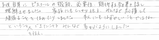 保育園のときにお世話になった病院で、先生をはじめ、看護師さんにも「大丈夫だよ!」「すごいね!よくなってるよ」と言われたことが親子共に励みになりました。