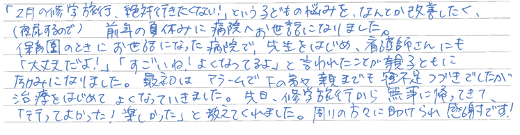 「2月の修学旅行、絶対行きたくない!」という子どもの悩み(夜尿するので)を、なんとか改善したく、前年の夏休みに病院へお世話になりました。