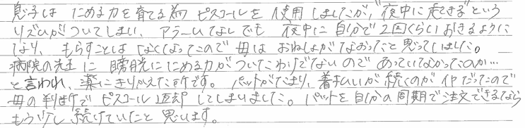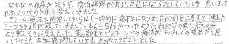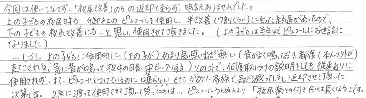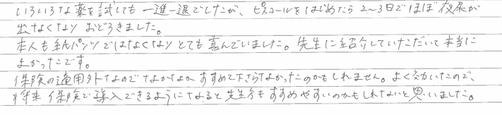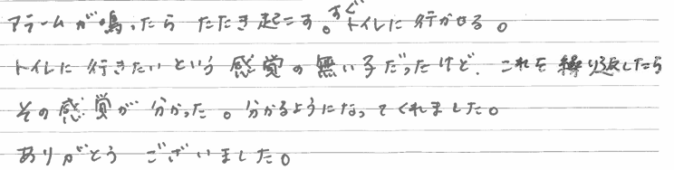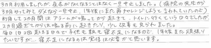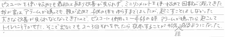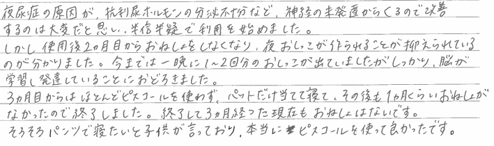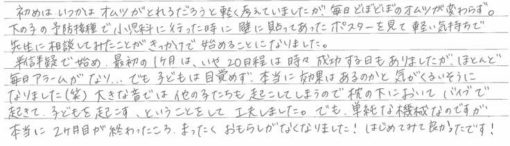夜尿症の原因が、抗利尿ホルモンの分泌不十分など、神経の未発達からくるので改善するのは大変だと思い、半信半疑で利用を始めました。