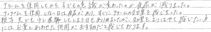 受信機の他にピスコールウォッチを子供の腕につけて寝ていたので本人も少しの振動でも起きてトイレに行く事が出来ていました。夜尿のタイミングを知ってからは、夜中トイレに行った後はパッドも外して下着だけで朝まで寝られるようにもなりました。