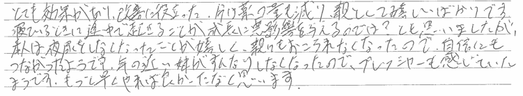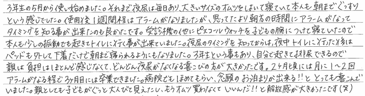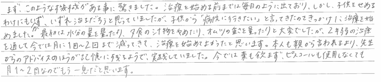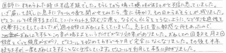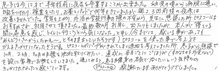 幼児の頃から病院に通い、日記をつけたり、検査をしたり、お薬とパッドで何年もきていましたが、週2・3回前後の夜尿は改善しませんでした。学年も上がり、外食や学校行事の際の不安から、先生に相談したところピスコールをおすすめされ、利用させて頂きました。