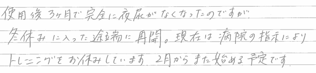 最初数カ月利用し、出たりもしましたが、本人が「寝ている間に尿意を感じ、トイレに行こうという気になった」と申し、今までは、感じる事があっても「面倒くさいからしちゃえ〜」とそのまま出していたそうです。