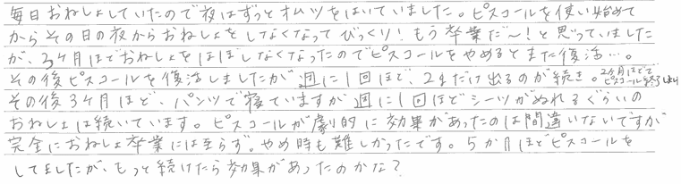 その後ピスコールを再開しましたが、週に1回ほど少量だけ出るのが続き、その後3か月ほどパンツで寝ていますが、週に1回ほどシーツが濡れるくらいのおねしょは続いています。