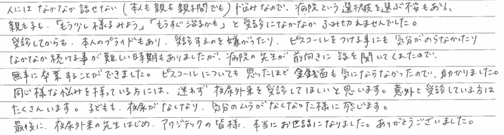 受診してからも本人のプライドもあり、受診するのを嫌がったり、ピスコールをつける事にも気分がのらなかったりなかなか続ける事が難しい時期もありましたが、病院の先生が前向きに話を聞いてくれたので、無事に卒業することができました。