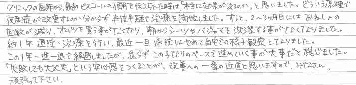 ピスコールについても思ったほど金銭面も気にならなかったので助かりました。同じ様な悩みを持っている方には迷わず夜尿外来を受信してほしいと思います。